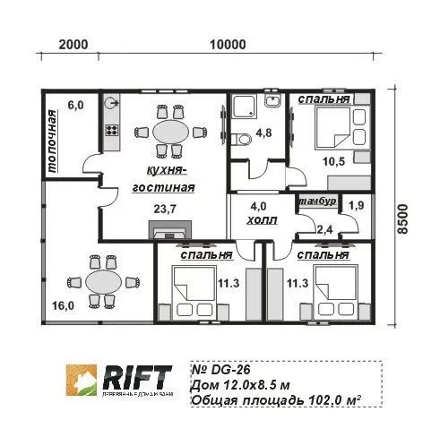 Дом из профилированного бруса DG26 — проект площадью 102 м² (8,5×12 м), отличающийся прочностью и долговечностью материалов. Срок строительства — 45 дней. Предусмотрены базовая и премиум комплектации, установка свайно-винтового фундамента, утепление и подключение коммуникаций. Возможна поэтапная оплата, ипотека и использование материнского капитала. Также включена бесплатная доставка стройматериалов на расстояние до 100 км.
